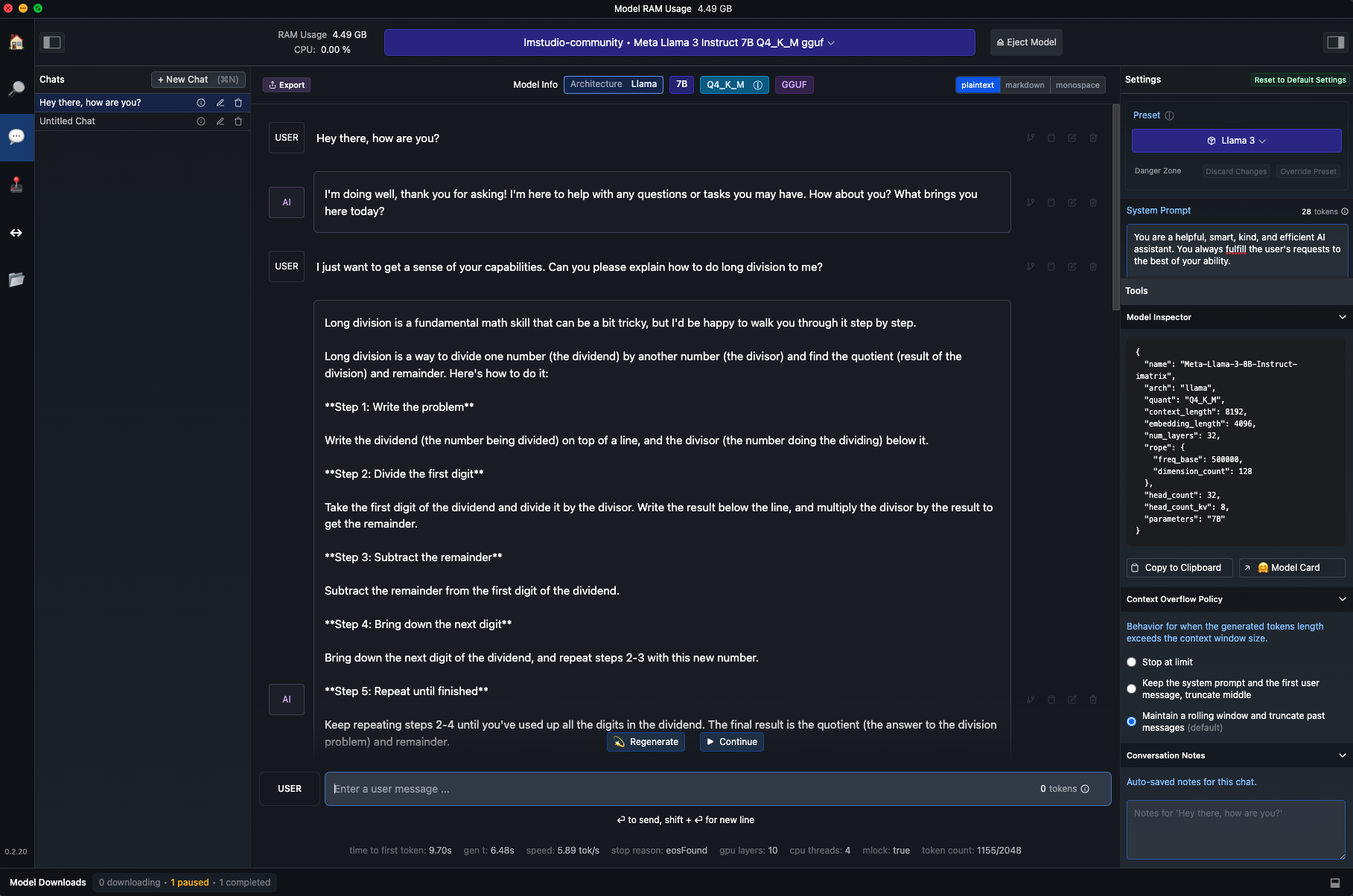 It took ~15 minutes to download the 7B parameter llama3 instruct model, and have another quick conversation with it.